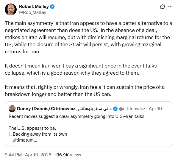 Meanwhile, Iran expert Robert Malley highlighted what we outlined in the Executive Summary: time favours Iran, at least in its own perception. The closure of the Strait generates increasing marginal returns for Tehran, while additional strikes deliver diminishing marginal returns for the United States.