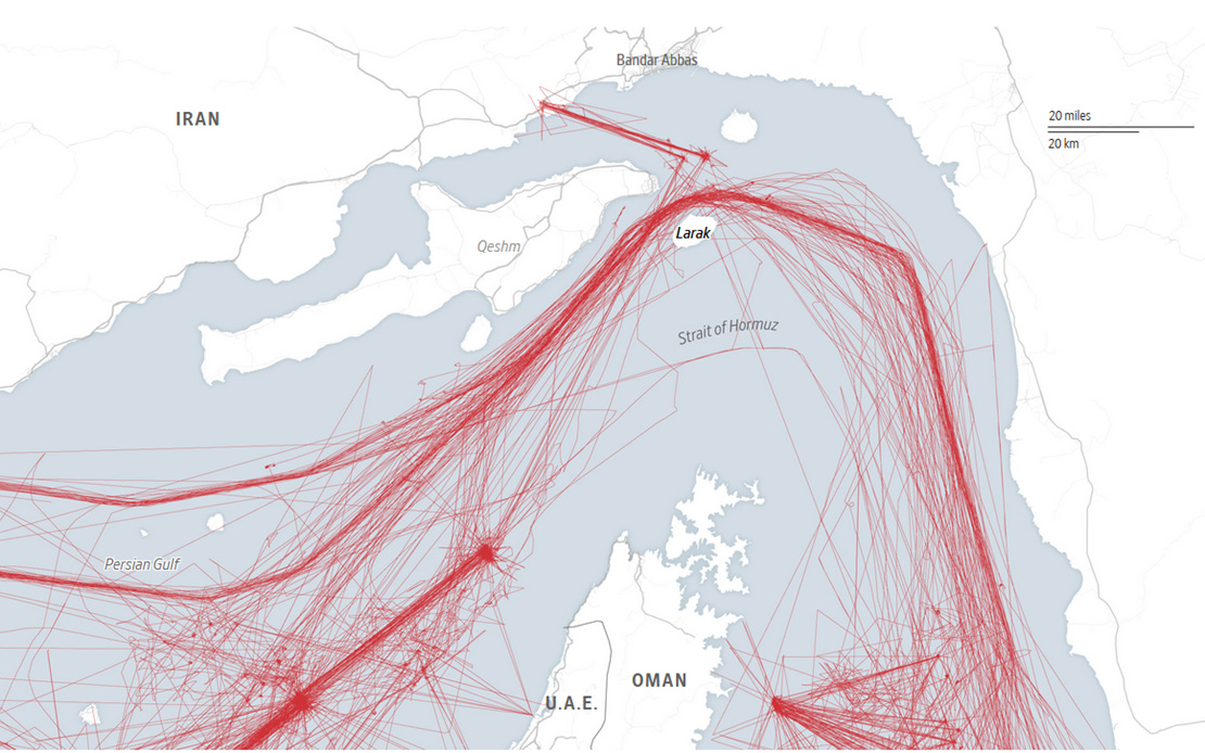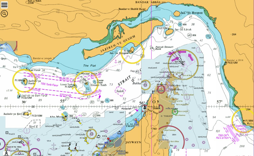 What we can observe is the routing. Approved vessels are directed north of the standard shipping lane, navigating a narrow corridor between Qeshm and Larak, hugging the Iranian coastline before exiting into the Gulf of Oman.