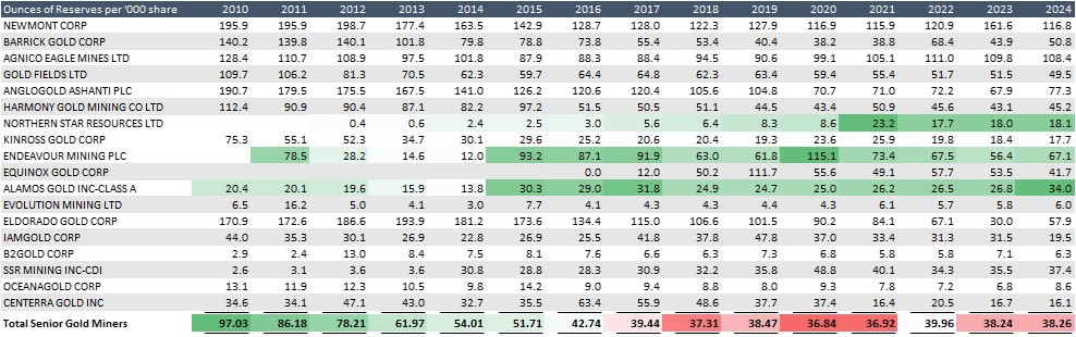Solving for Reserves per Share yields a brutal insight: as a group, senior gold miners went from 97.03oz per 1,000 shares in 2010 to 38.26oz per 1,000 shares in 2024. That’s a long-term, structural transfer of value away from existing owners.