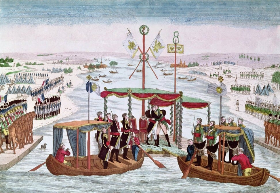 The goal was to project mutual respect and sovereign equality, with the meeting’s location—exactly at the midpoint of a border river—chosen to symbolize neutrality and balance. This stagecraft is vividly captured in the painting above, where flags, wreaths, canopies, and the armies arrayed on either bank reinforce the illusion of equal footing.