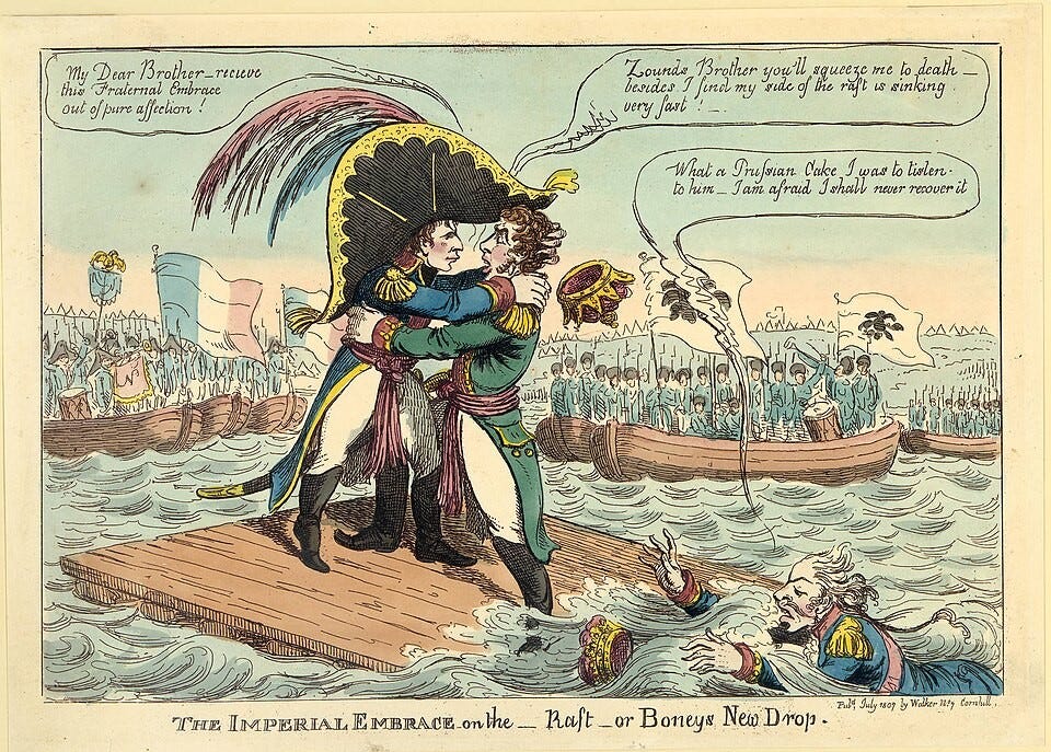 But the illusion was deliberate. A contemporary British caricature (see top picture) conveys the underlying power dynamic far more accurately: Napoleon and Alexander embrace in theatrical warmth, while the Prussian king—drenched and desperate—struggles in the water, his crown adrift, powerless.