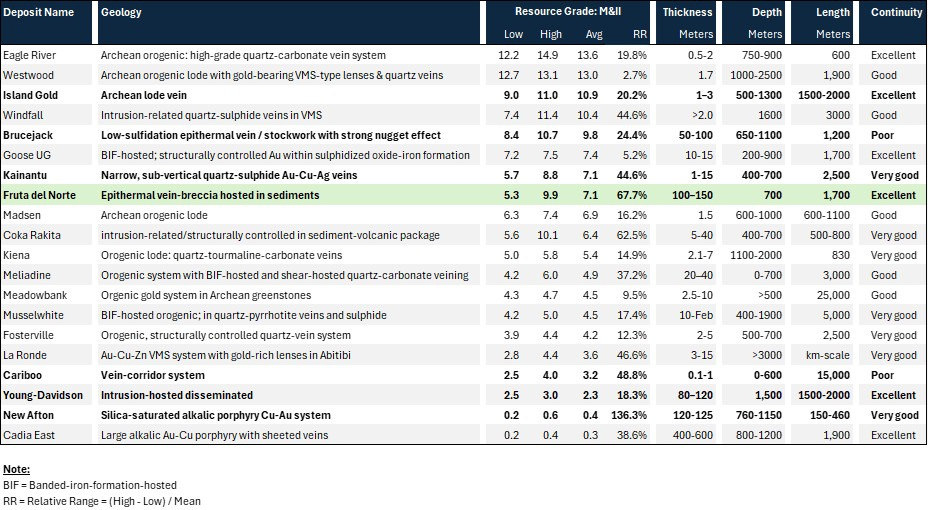 Geology Lesson: Now, please study the table again. Like the resource-development table in my Alamos write-up, it will teach you more than hours of mining-company financials. Why? Because most underground mines force a trade-off: you can have grade, or you can have width, or you can have continuity—but rarely all three. Island Gold is high-grade but narrow. Young-Davidson is wide but low-grade. Brucejack is rich but erratic. Kainantu is agile but vein-by-vein. Fruta del Norte alone delivers all three: a high-grade, thick, laterally continuous orebody—the kind of geometry explorers dream of but are highly unlikely to ever find in a career.