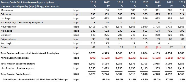 Set that against the western grid. Primorsk, Ust-Luga, St. Petersburg on the Baltic, Murmansk in the far north, and Novorossiysk on the Black Sea used to ship >2 mbpd of Urals into the EU and UK (note that mostly exports from Novorossiysk include exports from Kazakhstan too which are deducted below).