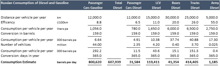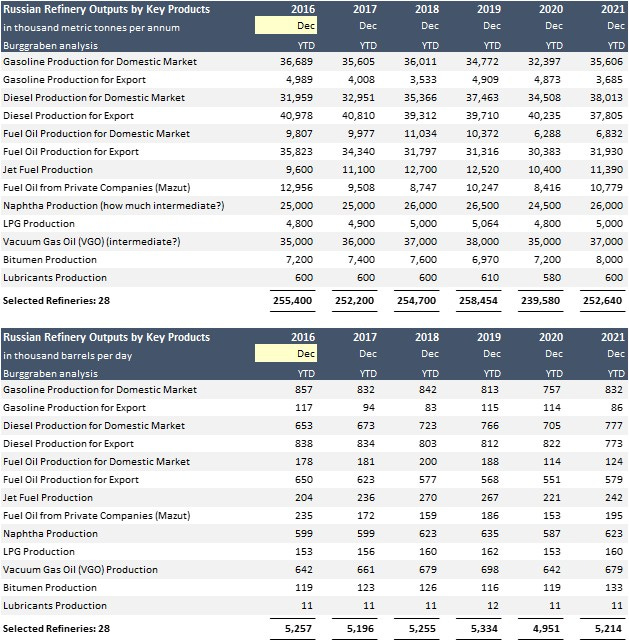 Those company tables are unusually useful because they split output into domestic sales and exports. That lets us check our demand math from the consumer side: around 800kbpd of gasoline burn at home, and roughly 750kbpd of diesel—leaving a diesel surplus on the order of 700–800kbpd for export.