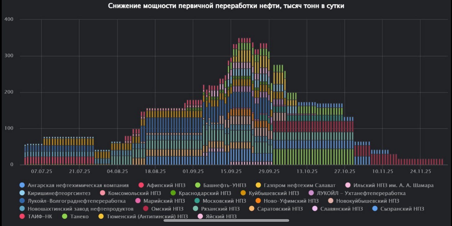 The capacity side is worse. In a 18 August 2025 Telegram post, Seala (Сиала) — a Russian energy-market analytics firm that compiles real-time stats on crude and product flows, refinery operations, and LNG — estimated that 226,000 tonnes/day of crude-refining capacity and 12,000 tonnes/day of condensate processing were offline nationwide at that time.