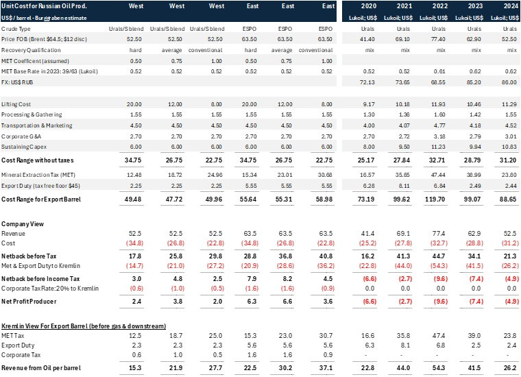 ESPO, by contrast, still clears near Brent in Asia — often at very narrow discounts or the occasional small premium. Call it $64.5 FOB at Kozmino against a broadly similar operating stack (with some east-side fiscal quirks). That leaves a pre-MET margin in the mid-30s per barrel. In other words: the premium eastern barrel pays for the war without immediately starving every upstream project that touches it as you can clearly see in my first table above.