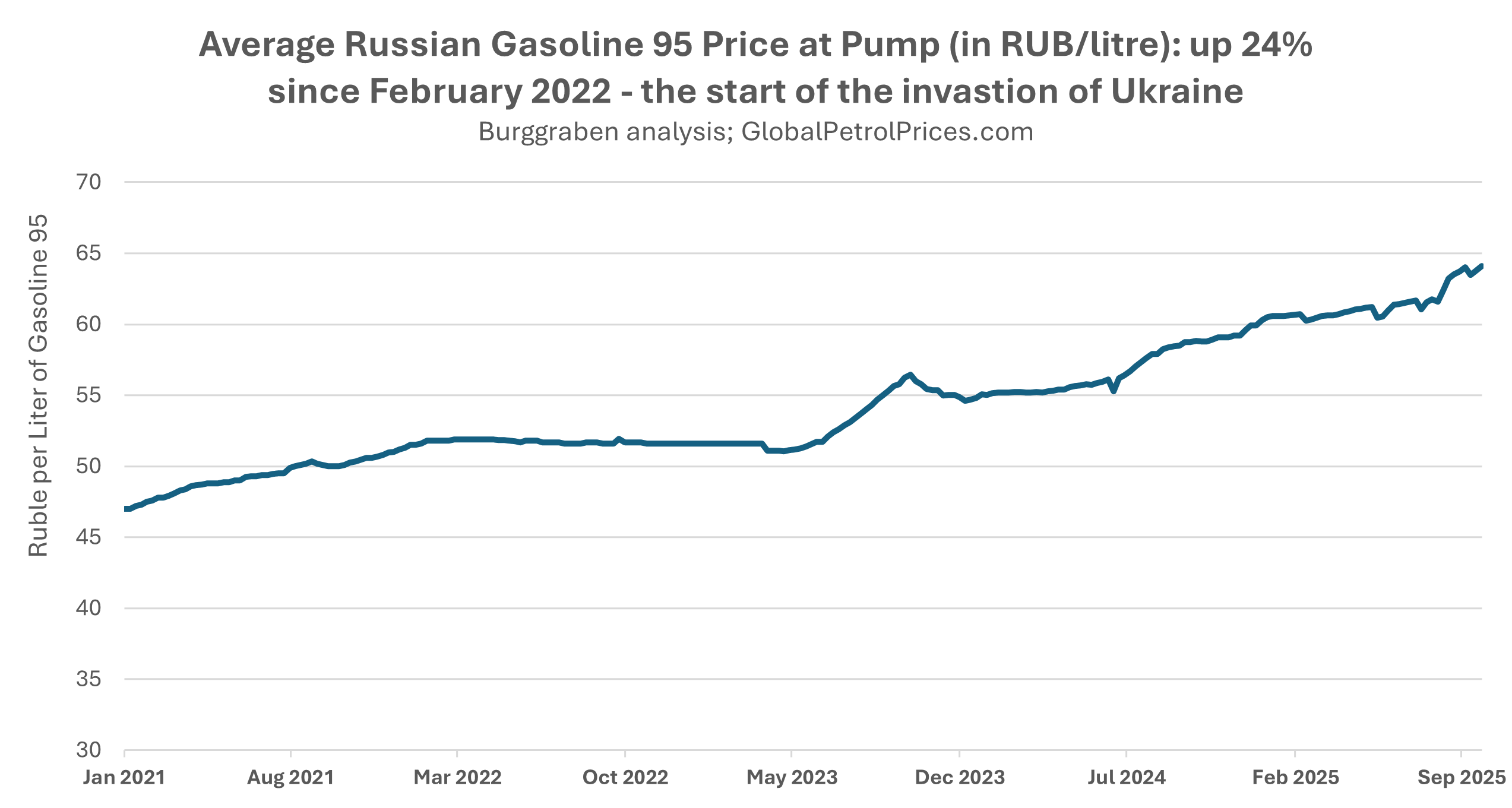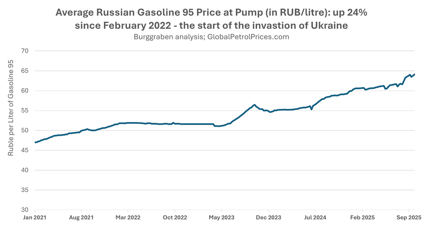 By the time the siloviki finished re-wiring ownership, most of Russia’s refining sat inside state or state-aligned groups (with Rosneft roughly 40%). Retail prices were essentially administered—via excises, the ‘tax manoeuvre,’ the 2019 damper, and ad-hoc export curbs. The net effect wasn’t just higher prices over time; it was a system optimized for central control and export netbacks, not resilience. When a few big refineries go down, there are fewer independent suppliers, thinner inventories, and the shortage shows up at the pump fast.