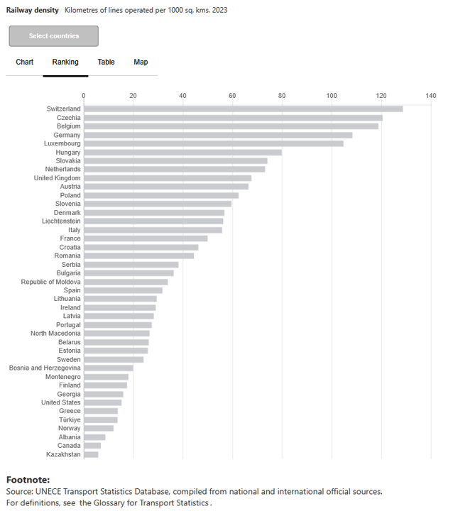 Measured as track per land area, Switzerland has about 129km per 1,000 km² (Germany 108; UK 131; France 43). The U.S. and Russia sit near the bottom—single digits per 1,000 km²— because their distances are continental and populations are spread out. Sparse track can still haul a lot of coal and containers. But it does not automatically move people.