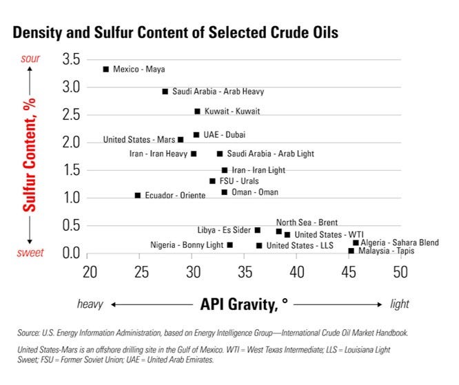 Then comes the feedstock - I usually like to call it the refinery diet. Most of the domestic system runs on Urals, a medium-to-heavy, sour grade (about 31–32° API, 1.3–1.4% sulfur). U.S. refiners, by contrast, process a lighter, sweeter diet—WTI 39–40° API plus very light shale streams blended with heavier Canadian barrels.