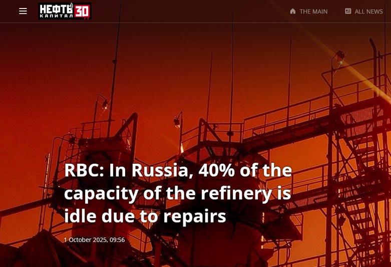 More recent reads are starker. Citing Seala’s plant-by-plant analytics, RBC Pro—the paywalled professional edition of the RBC business outlet—reported that by 28 September roughly 38% of Russia’s primary (CDU) refining capacity—about 338,000 t/day—was idle, while capacity suitable for producing gasoline and diesel fell 6% in August and a further 18% in September. On 1 October 2025, OilKapital repeated the same Seala-based figures: roughly 38% of primary units were down, i.e., this was not routine maintenance.