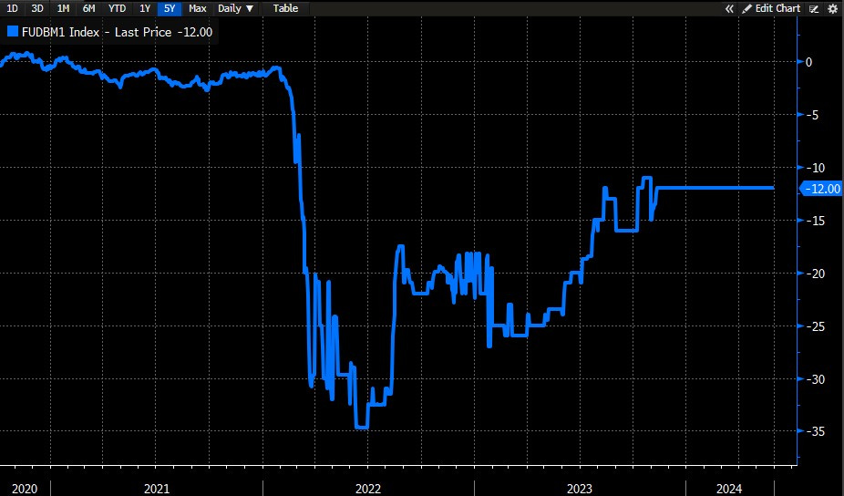 Sanctions and logistics frictions force Moscow to sell Urals at steep discounts to India and Turkey. In 2024, Bloomberg still quoted the Urals–Brent differential at roughly minus $12/b (see chart) — textbook monopsony: a few dominant buyers squeezing a captive supplier. The discount isn’t ideology; it’s just that Indian refiners like cheap.